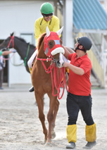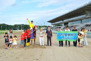 殊勲の手綱は、デビュー12年目で重賞初制覇となった小谷周平騎手。もともとは、目下全国リーディングの木村健騎手で臨む予定だったが、ちょうど1週間前の開催から腰痛が悪化して騎乗を取止めていた。その時点では、さすがにほかのリーディング上位騎手は騎乗馬が決まっている。そこで白羽の矢が立ったのが、普段からトーコーヴィーナスの調教をつけている小谷騎手だった。小谷騎手には4人のお子さんがいて、間もなく5人目が産まれるという。この日は家族全員で競馬場での応援。「子どもとヨメさんと一緒に(口取り)写真を撮るのが、結婚してからのひとつの目標だった」という、夢をかなえた瞬間だった。
