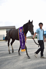 4コーナーで内から上がってきたキングオブザメインと接触して外に膨れてしまいましたが、それがなければもっと楽に勝っていたでしょうね。最初の頃はスタートも出なかったし、まだトモが甘く、最近やっとまともに調教できるようになってきたくらいなので、もっと強くなってくれると思っています。