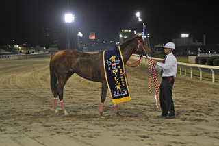 3歳牝馬のロジータ記念と2歳牝馬のローレル賞が一夜にして行われた豪華なひととき。開催ごとに装いが変わる川崎競馬場名物の誘導馬たちも、このダブル重賞は女王のいでたちで魅せてくれた。